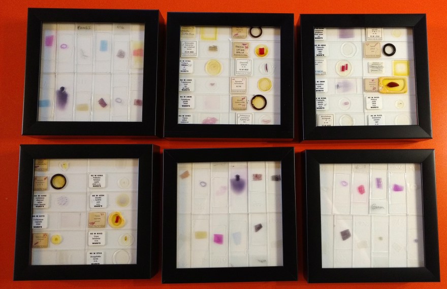 Microscope slides spend most of their life in a dark box, usually in a drawer. From time to time, they are put under an intense light for a few minutes, and then returned to their assigned spot. Clinical slides are read, observations are recorded, and they are stored. When a biologist describes a new species of microbe, they are deposited onto type slides and submitted to a museum for safe keeping. Samples are fixed for eternity. Microscope slides are utilitarian; any biology student has likely prepared, viewed and discarded hundreds of them. This piece steps away from the microscope to view these slides with the naked eye. The myriad of colours, shapes, and labels all fixed on a 1” x 3” piece of glass. Now they are free from the drawer, sandwiched between museum glass, and set in frames for viewing and appreciation.